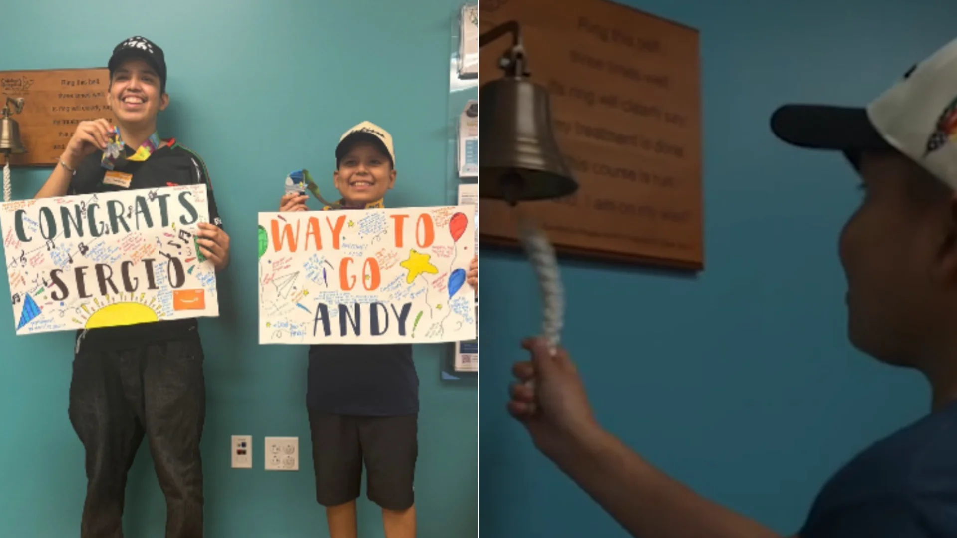 Sergio, de 18 anos, e Andy, de 11, foram diagnosticados com o mesmo tipo de tumor cerebral raro e venceram a doença no Children’s Hospital Los Angeles (CHLA). Em junho, os dois tocaram juntos o sino que marca o fim do tratamento, em um momento celebrado pela equipe médica e pela mãe, Rosalba.