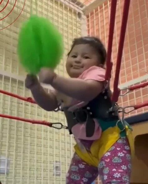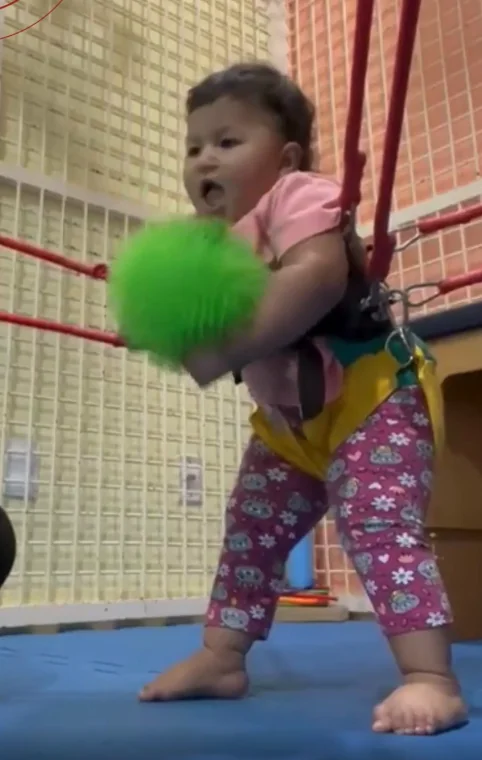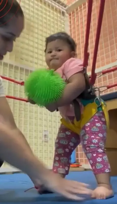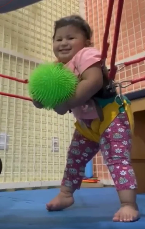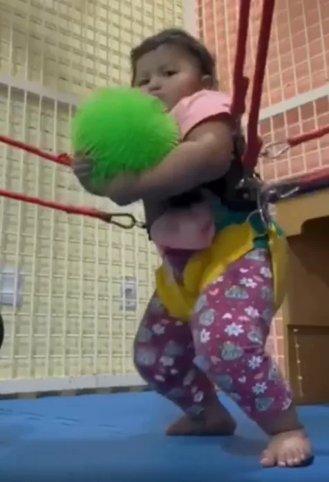 Sem vagas disponíveis pelo Sistema Único de Saúde, a família arcou com sessões particulares de fisioterapia para ajudar no desenvolvimento motor da menina. A falta de tônus muscular é uma das características da síndrome, que também afeta a postura e os movimentos.