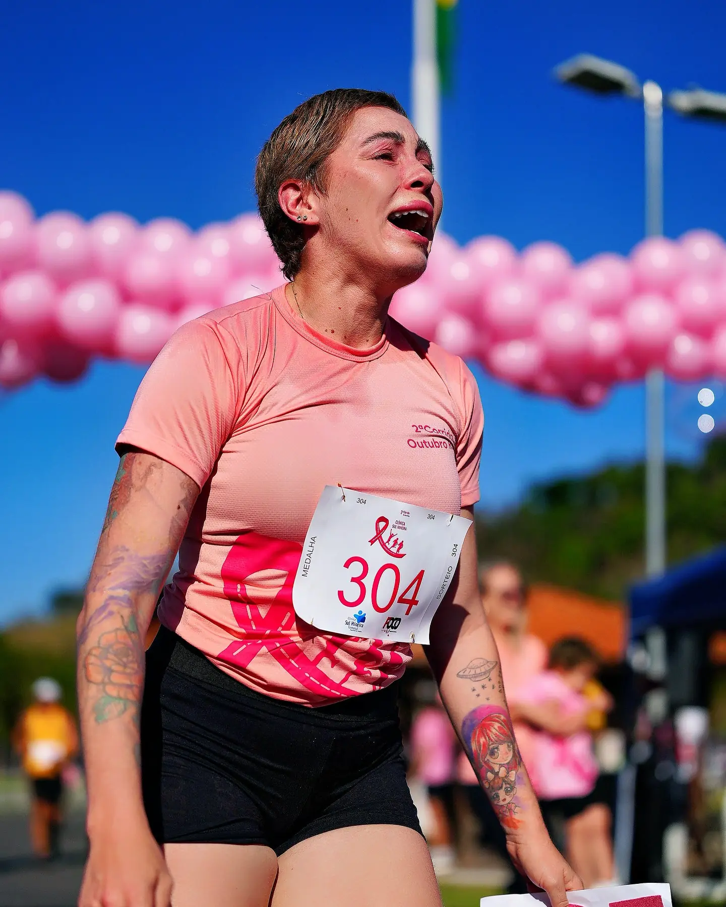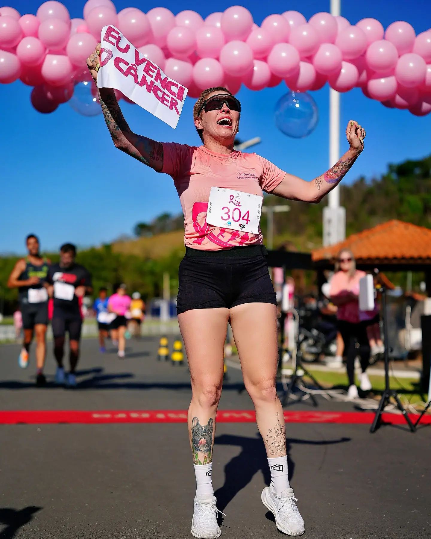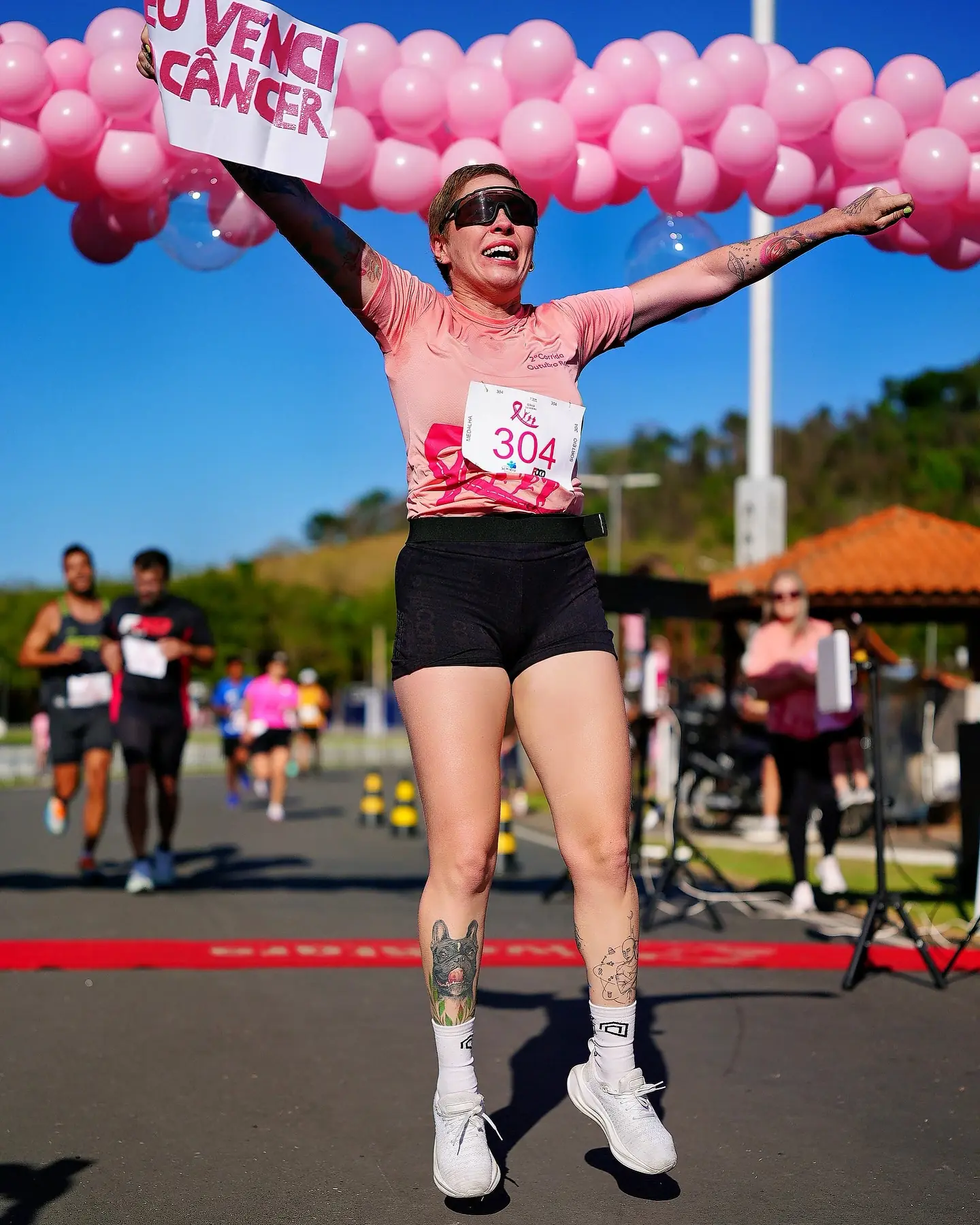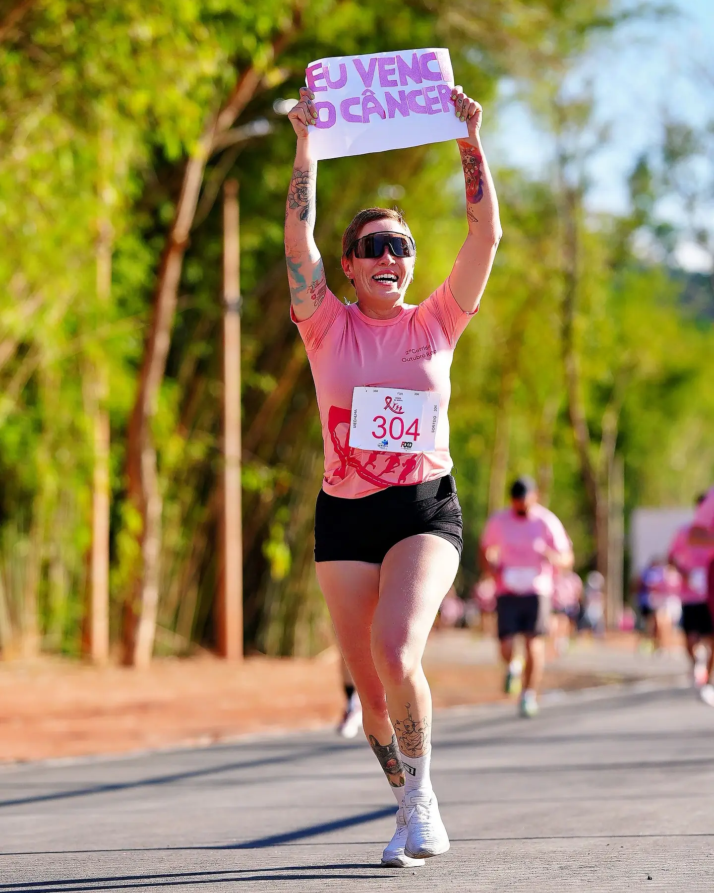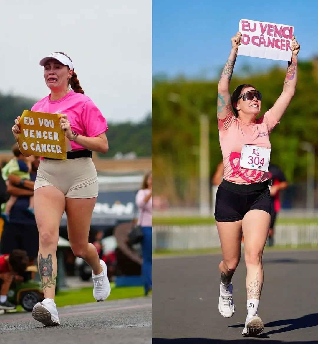 A imagem que viralizou mostra Taine durante uma corrida em 2025, segurando um cartaz com a frase: “eu venci o câncer”. O registro foi feito exatamente um ano depois de outro momento simbólico em 2024, durante uma prova, ela exibiu o cartaz que dizia “eu vou vencer o câncer”, quando ainda enfrentava o tratamento.
