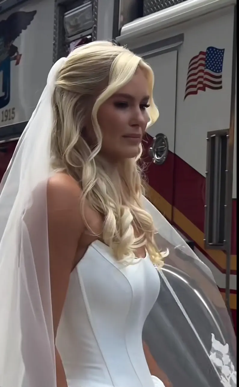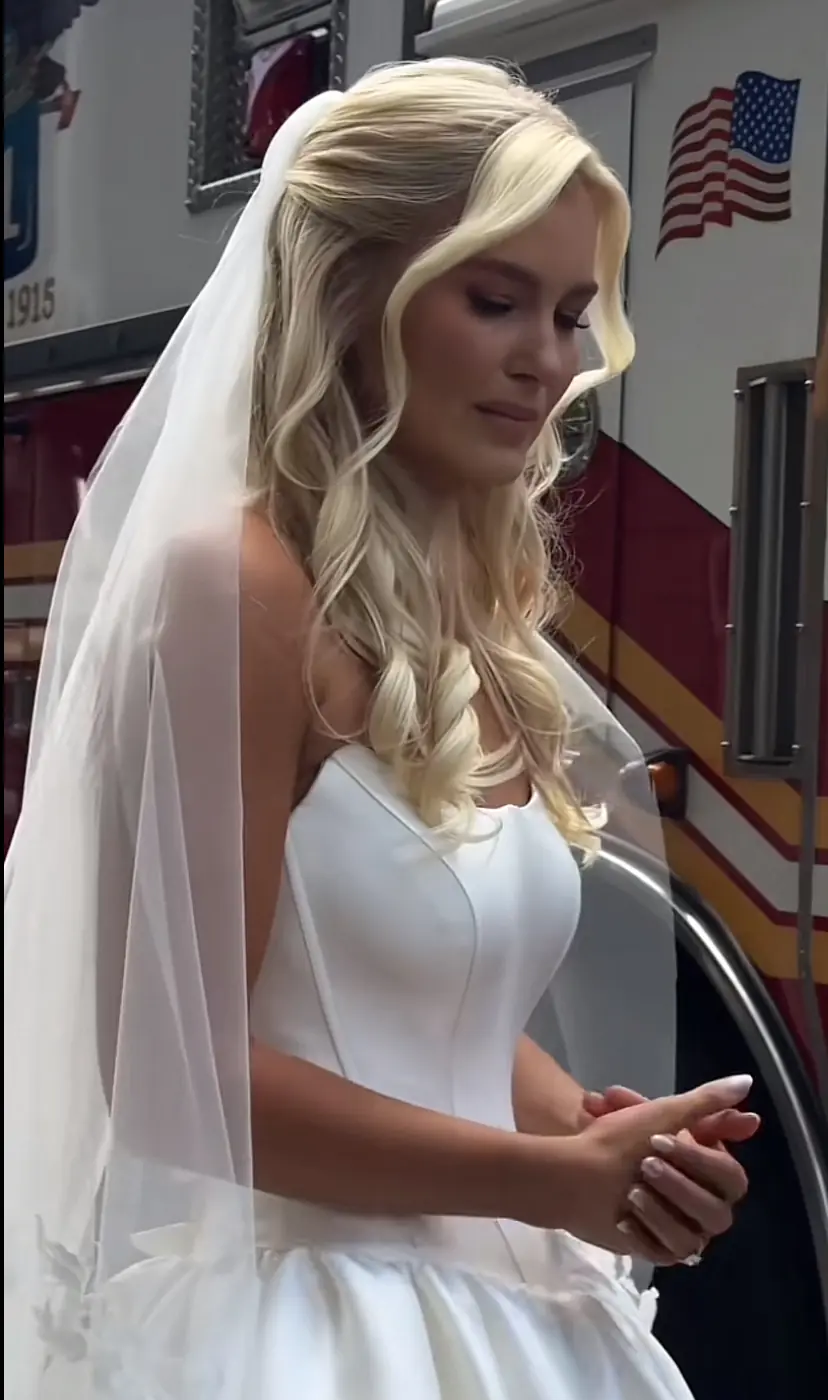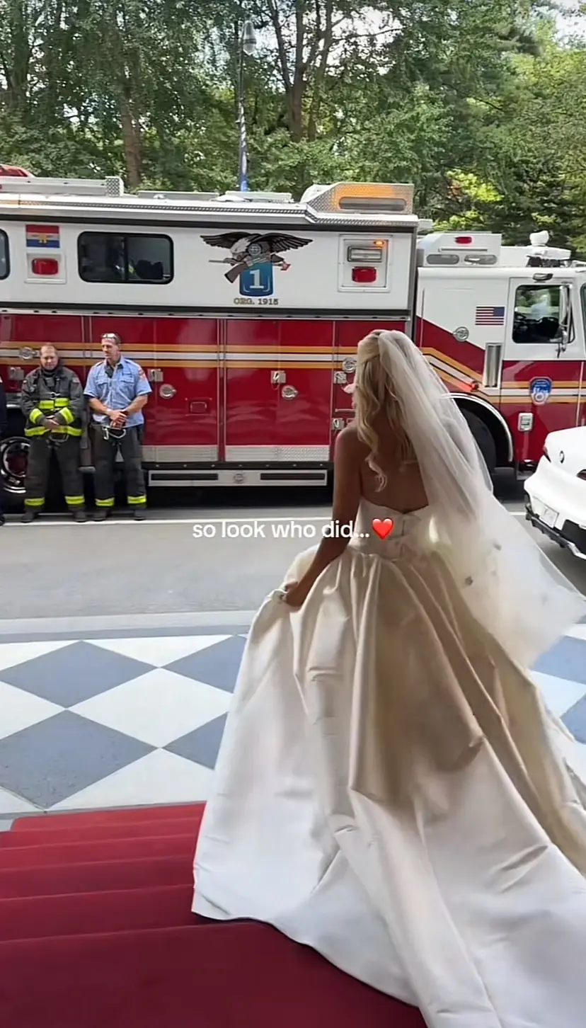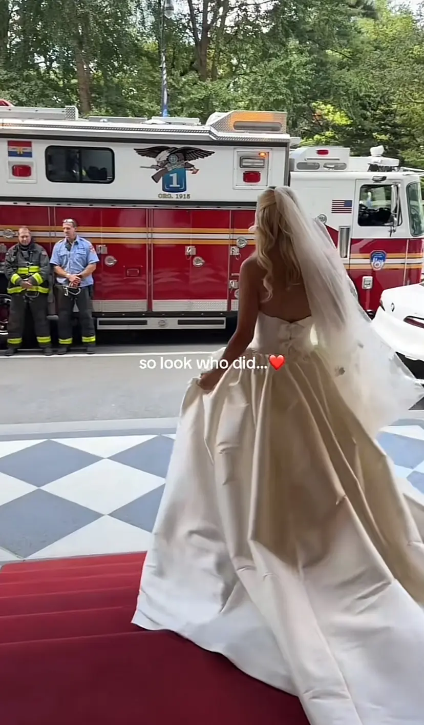 Ao deixar o Plaza Hotel, onde se preparava para o casamento, a noiva foi recebida por bombeiros alinhados em frente à entrada, vestidos de uniforme e acompanhados por dois caminhões da corporação. “Os bombeiros, atuais e aposentados, superaram minhas expectativas. Eles me escoltaram do Plaza Hotel até o local da cerimônia e ainda me presentearam com um pingente dourado com as Torres Gêmeas e o símbolo do FDNY, além de um prendedor da Rescue One para o terno do Noah”, relatou.