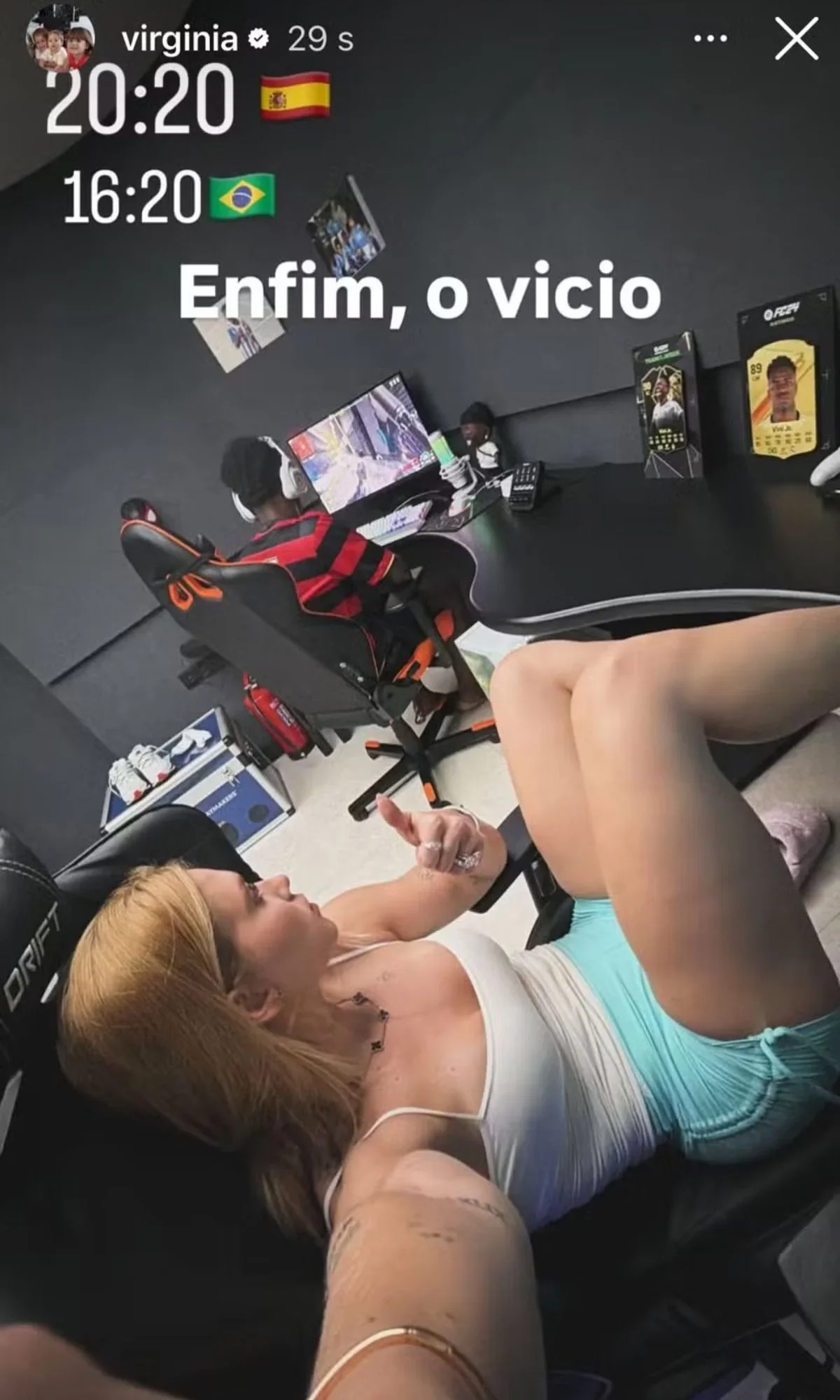 Na manhã desta sexta-feira (31/10), Virginia compartilhou com seus seguidores momentos da rotina na capital espanhola. Em vídeos publicados nas redes sociais, as filhas aparecem brincando na academia da casa enquanto os adultos relaxavam na sala assistindo televisão. “Uma parte da turma treinando e a outra trabalhando/assistindo TV”, escreveu ela.