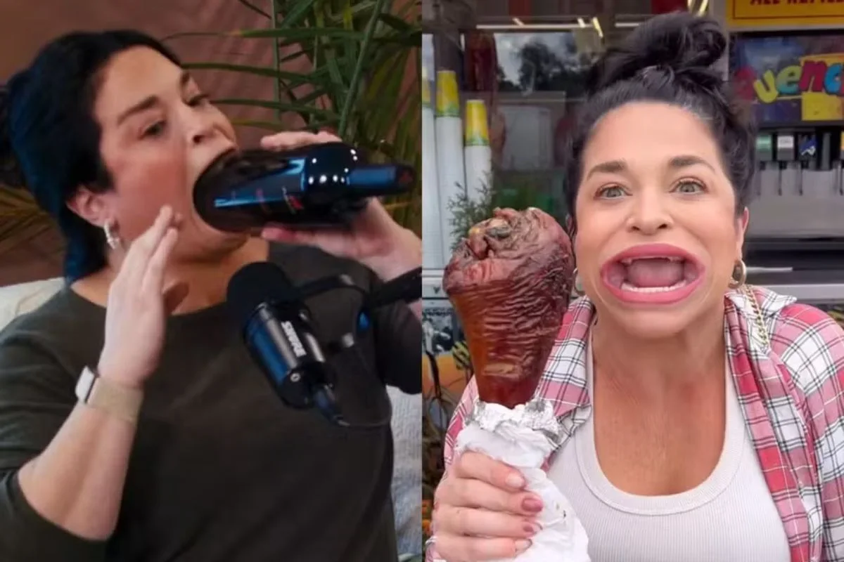 A americana Samantha Ramsdell, que já foi reconhecida pelo Guinness Book como a mulher com a maior boca do planeta, voltou a ganhar destaque nas redes sociais. Em vídeos recentes, ela aparece experimentando diversos alimentos e surpreende os internautas ao conseguir engolir quase metade de cada item de uma só vez.