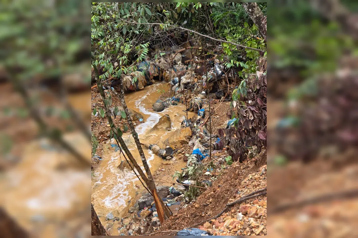 Resíduos do aterro sanitário Ouro Verde atingem o córrego Santa Bárbara após novo deslizamento em Padre Bernardo (GO). (Foto: Instagram)