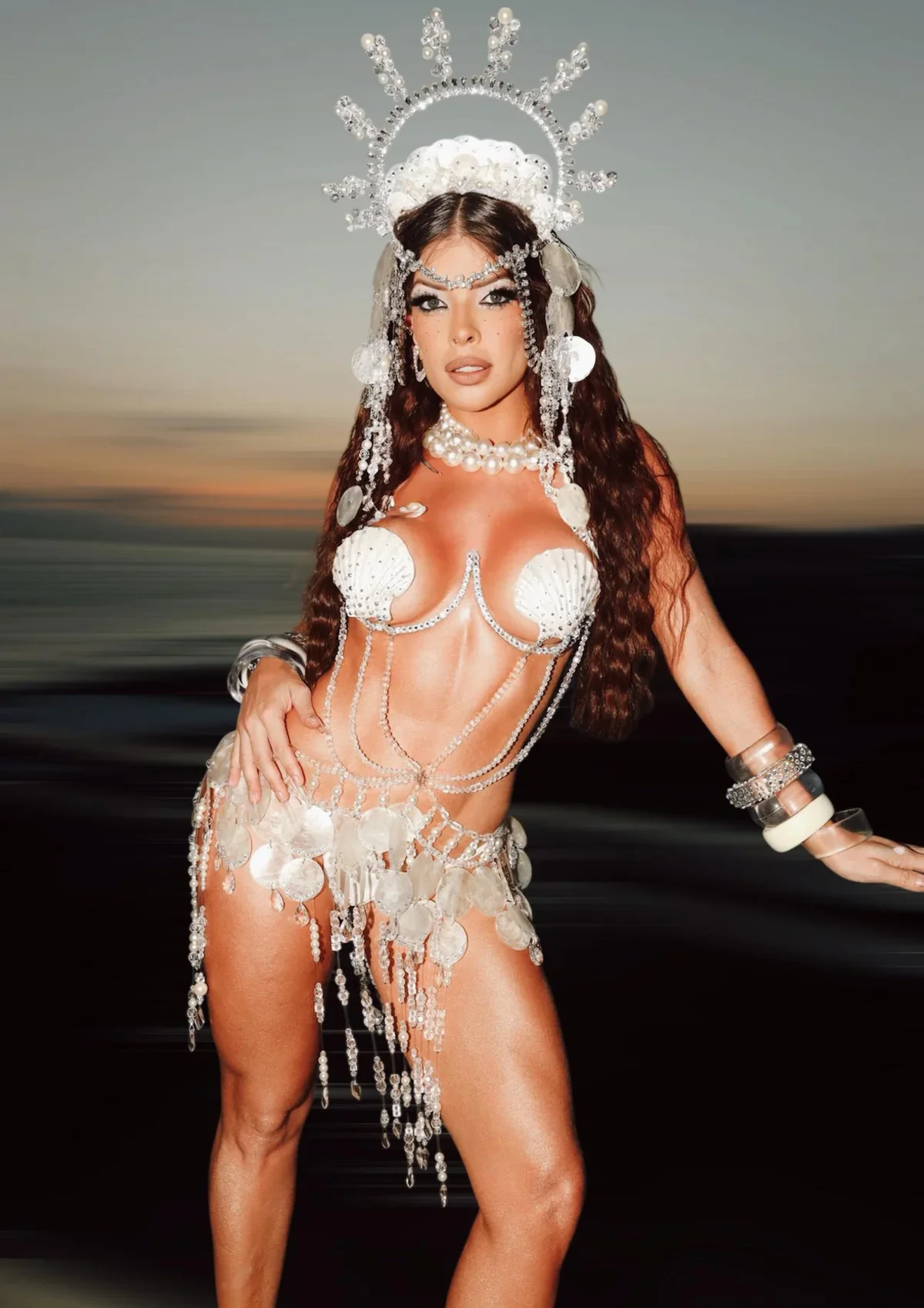 Jaquelline Grohalski, conhecida por sua participação no BBB e em A Fazenda, atraiu todos os olhares durante o primeiro mini desfile da Grande Rio, realizado neste domingo (30/11), na Cidade do Samba, no Rio de Janeiro. Como musa da escola, ela revelou com exclusividade os detalhes de seu traje feito à mão, decorado com pérolas, conchas e strass. O item mais impressionante do visual foi o acessório de cabeça, que pesa cerca de quatro quilos.