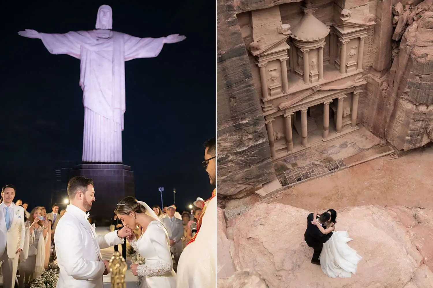 Sob o Cristo Redentor ao anoitecer e no desfiladeiro de Petra, casais transformam marcos históricos em palcos íntimos para o “sim”. (Foto: Instagram)
