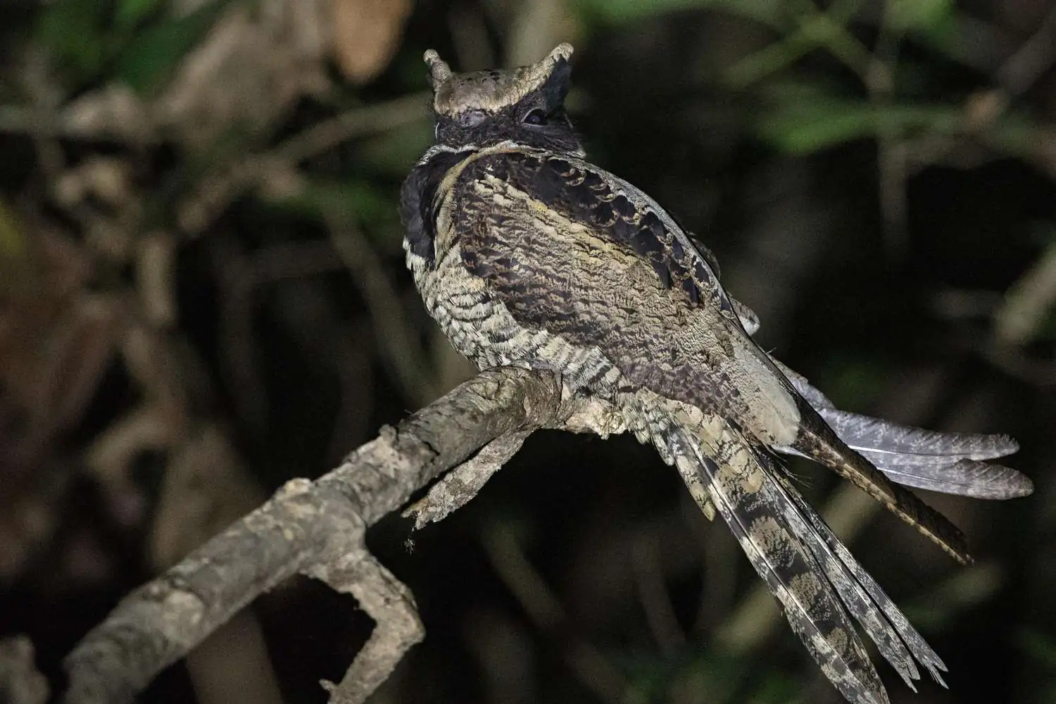Great Eared Nightjar (Lyncornis macrotis) exibe suas “orelhas” de penas douradas em meio à escuridão da floresta. (Foto: Instagram)