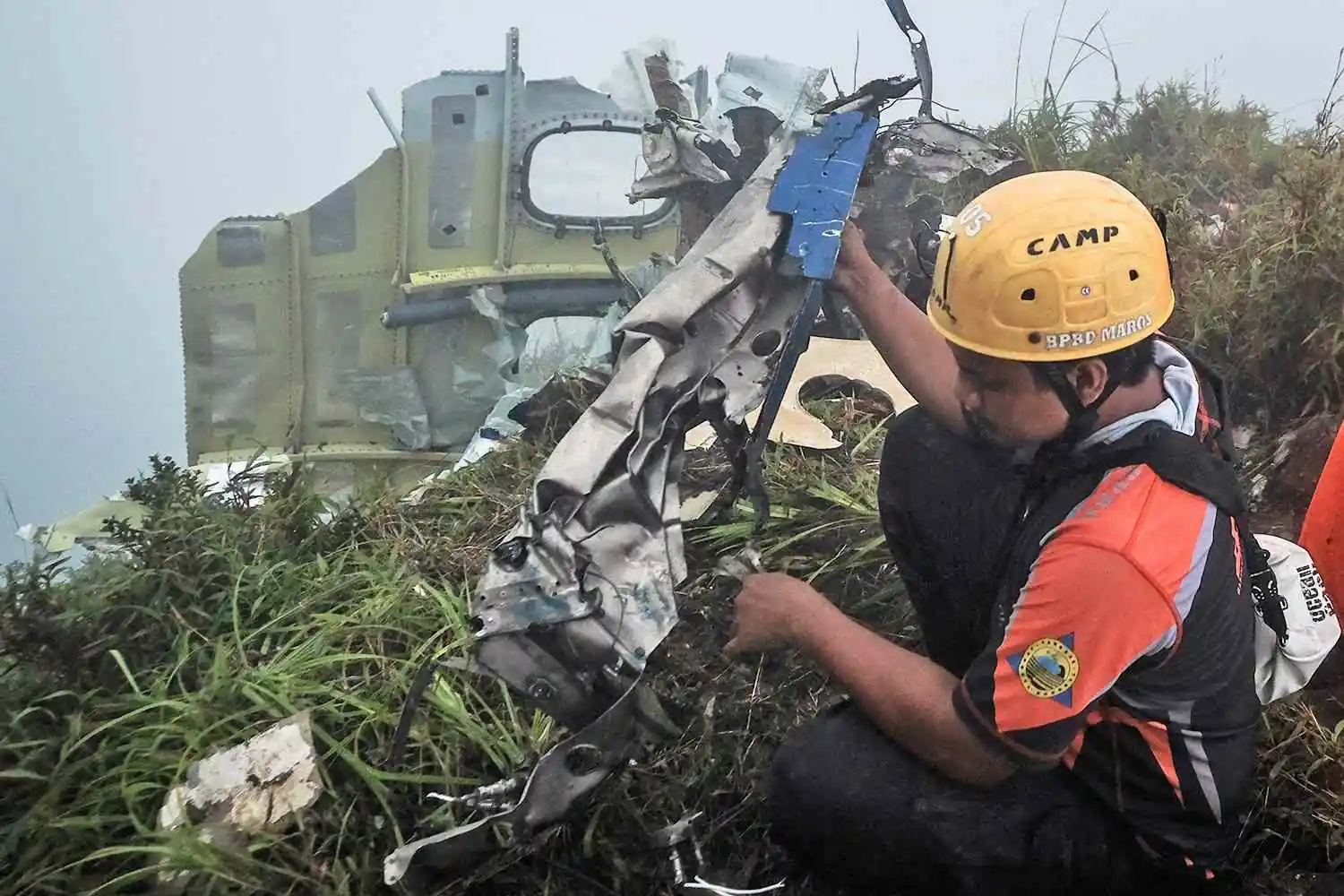 Resgatista coleta destroços do ATR 42-500 no sopé do Monte Bulusaraung (Foto: Instagram)