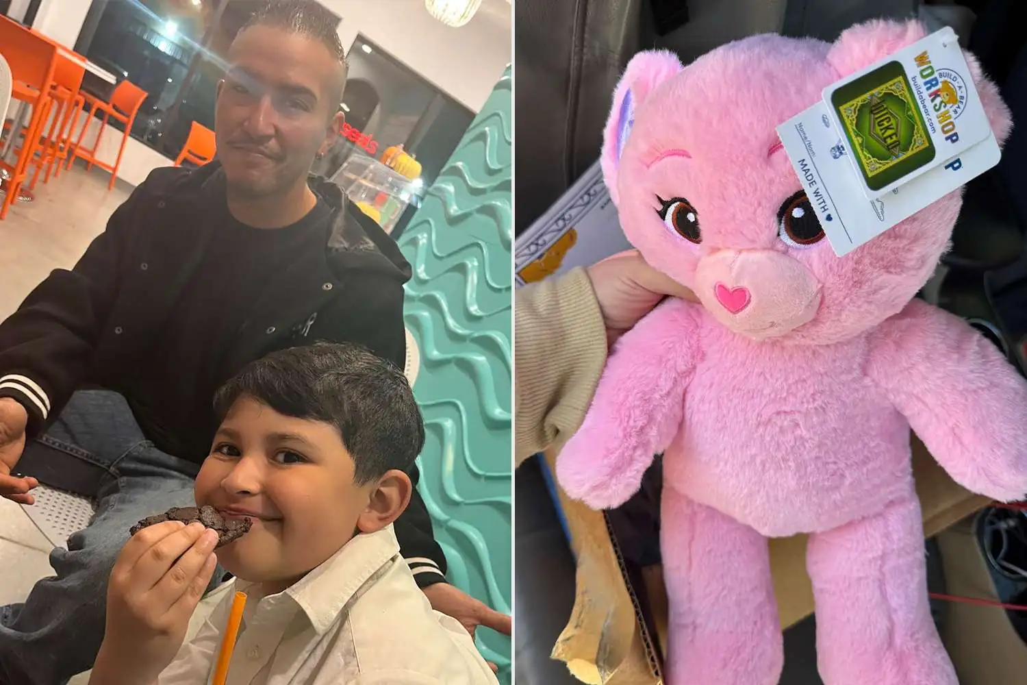 Azriel ao lado de foto do pai Antonio Palomino e o ursinho rosa da Build-A-Bear com a voz gravada (Foto: Instagram)